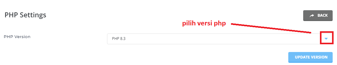- Pilih versi PHP yang diinginkan (misalnya, PHP 7.4, 8.0, dll.) dari dropdown menu.
