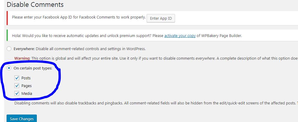 5. Selanjutnya anda tentukan mana yang mau di nonaktifkan ada tiga pilihan Post,Pages,Media klik tombol Save untuk menyimpan setting Disable Comment.