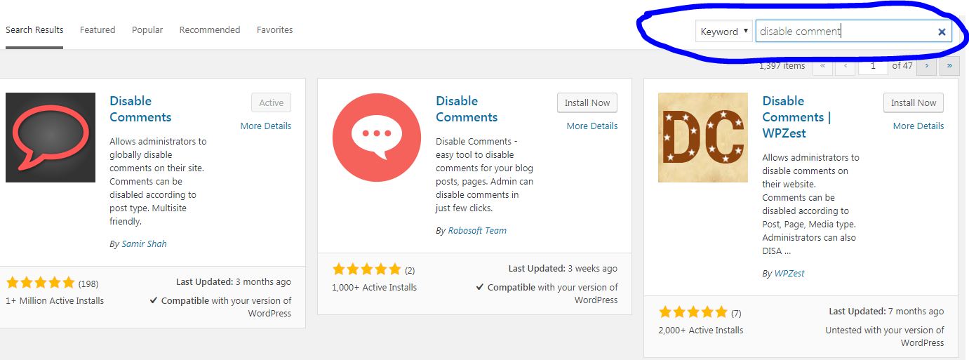 2. Pada kotak pencarian ketikkan nama plugin “Disable Comment”