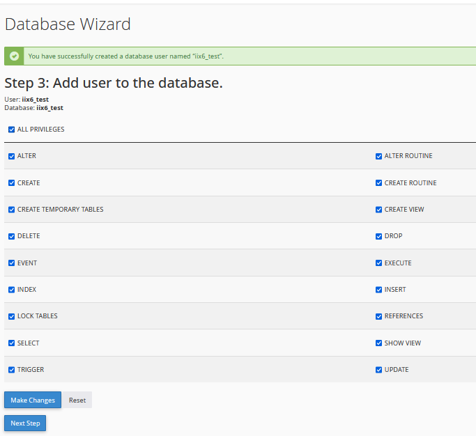 - Setelah memilih hak akses yang sesuai, klik Next Step.cPanel akan mengonfirmasi bahwa hak akses telah diterapkan dengan benar untuk pengguna tersebut.