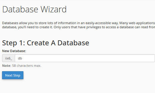 - Setelah memasukkan nama database, klik Next Step.cPanel akan membuat database baru dengan nama yang Anda tentukan. Biasanya, nama database akan diberi prefiks akun Anda, misalnya