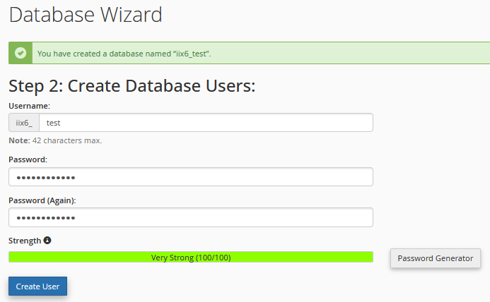 - Setelah memasukkan username dan password, klik Create User untuk membuat pengguna baru.cPanel akan memberi Anda konfirmasi bahwa pengguna telah berhasil dibuat.