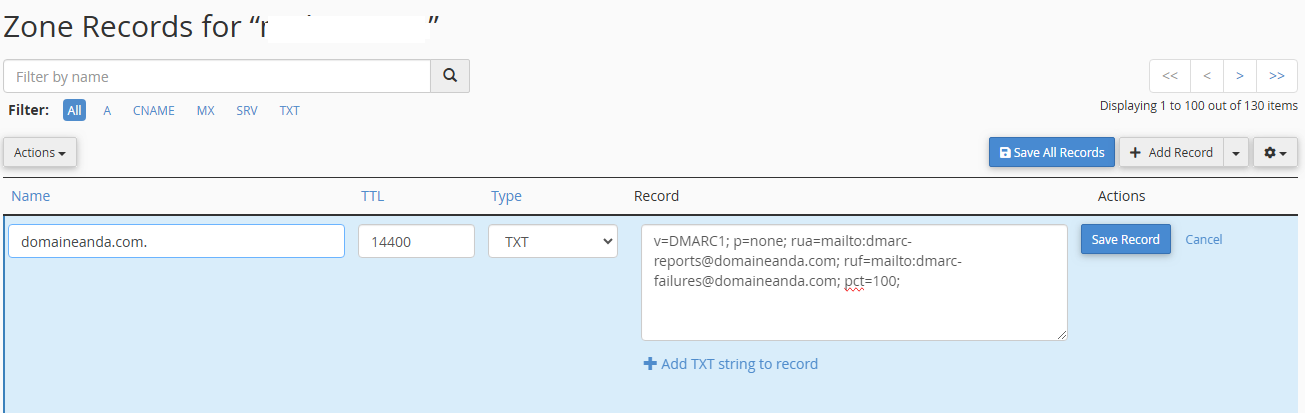 Setelah memasukkan catatan tersebut, klik “Add Record” atau “Save” untuk menyimpan catatan DMARC.