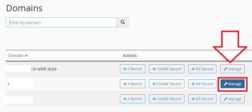 - Di halaman Zone Editor, cari domain yang ingin Anda tambahkan catatan DMARC, kemudian klik pada “Manage”.