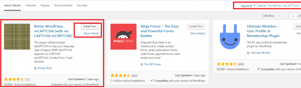 2.Ketikkan Better WordPress reCAPTCHA (with no CAPTCHA reCAPTCHA) di kolom Pencarian Plugin