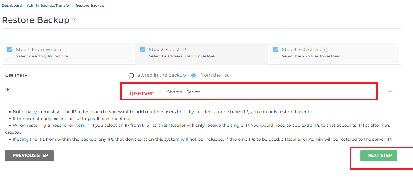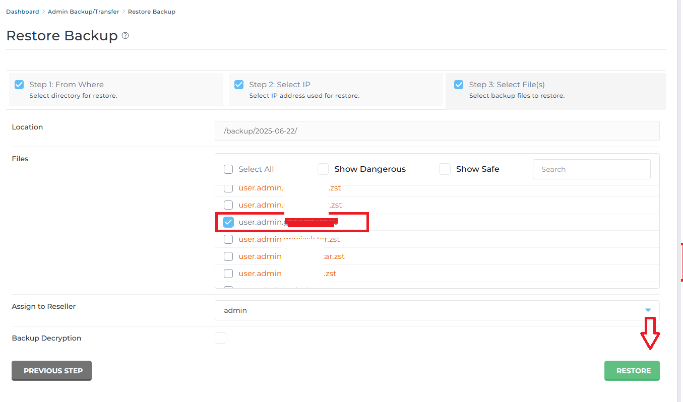 Pilih file: user.admin.username.tar.zst dan pilih admin untuk shared hosting atau user lain jika under reseller