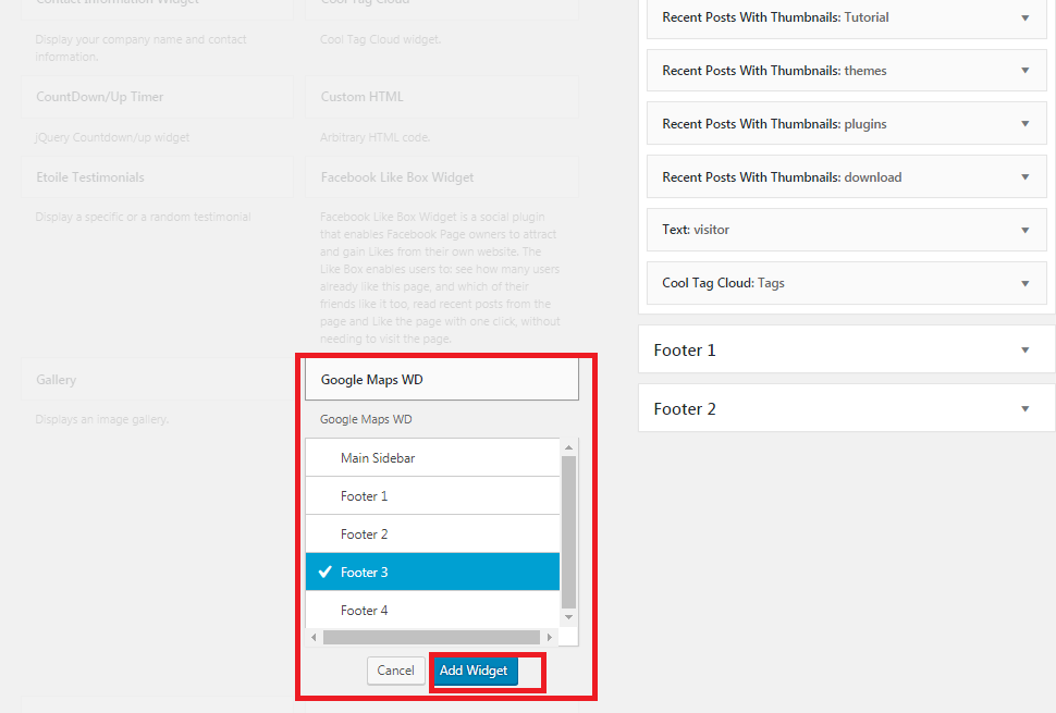 pilih google Maps WD dan pilih mau diletakan dimana contoh Footer 3 klik add widget