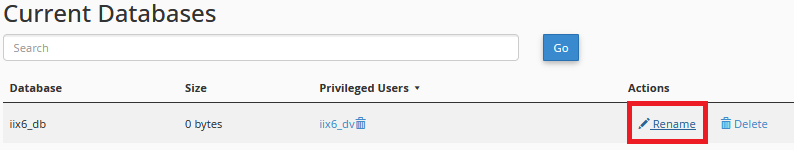 Bagian Current Databases memungkinkan Anda untuk mengelola database yang sudah ada. Di bagian ini, Anda dapat melakukan dua tindakan utama: Mengubah Nama Database dan Menghapus Database.