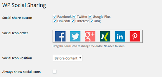 WP Social Sharing dapat membut anda mudah dalam menambahkan beberapa tombol sharing sampai 6 tombol dari social networks utama, ini termasuk seperti Facebook, Twitter, LinkedIn dan Pinterest. Pada settings anda akan menemukan pilihan untuk membuat tombol share tertampil secara otomatis. Anda dapat memilih tombol tersebut tampil di post, halaman, mediadan post tipe custom.