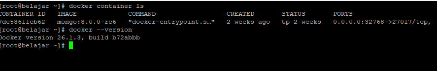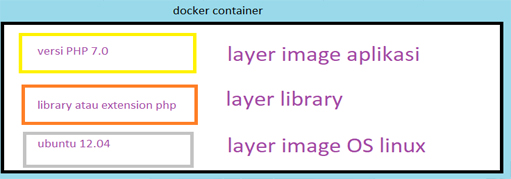 - Docker Container: berada di atas image. Setiap perubahan yang disimpan pada container akan menyebabkan terbentuknya layer baru di atas base image. Docker container dibuat menggunakan Docker daemon.berikut contoh container