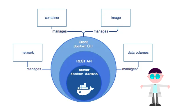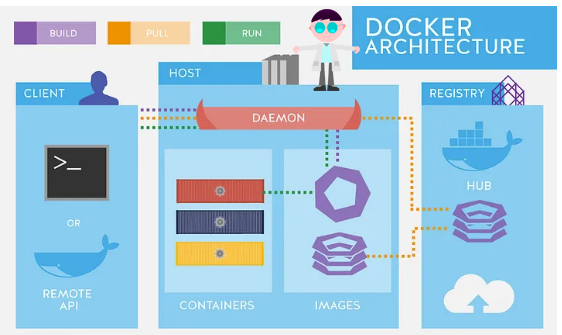 Arsitektur Docker adalah daemon Docker, yang menyediakan lapisan yang mengabstraksi spesifikasi OS dari pengguna sekaligus memberikan pengguna tersebut kemampuan untuk menangani semua aspek siklus hidup container (mulai dari build, install, run, hingga pembersihan) dalam sebuah cara yang mudah digunakan dan dapat diulang. Kontainer menjadi sangat populer karena manfaat yang diberikan oleh abstraksi ini.